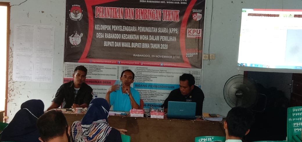 Pelantikan dan bimbingan teknik KPPS desa Rabakodo diselenggarakan di Kantor desa Rabakodo Minggu 29 November 2020. Bimbingan Teknik ini diharapkan bisa menjadi pembekalan untuk para anggota KPPS supaya lebih siap pada waktu pelaksanaan pemungutan suara serentak yang akan diselenggarakan pada hari Rabu 09 Desember 2020 mendatang. pelatihan diselenggarakan agar petugas memahami tugas pokok dan fungsi selama pemungutan suara.