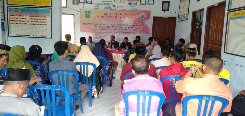 Acara yang dihadiri oleh unsur Pemerintah Desa, BPD, Ketua RT/RW, Pengurus Lembaga Kemasyarakatan Desa serta tokoh agama dan tokoh masyarakat serta dari Pendamping Desa dan Pendamping Lokal Desa ini dibuka secara resmi oleh Kepala Desa Yang Di wakili Oleh Sekretaris desa Rabakodo, Syamsuddin, S.Pd. Dalam sambutannya, Sekretaris Desa menyampaikan bahwa Musyawarah Desa ini merupakan langkah awal penyusunan Rencana Kerja Pemerintah Desa (RKP-Desa) tahun 2022. Dalam musyawarah desa tersebut agenda yang dibahas adalah mencermati ulang dokumen RPJM Desa untuk kegiatan tahun 2022. Selanjutnya sesuai tahapan setelah dilaksanakannya Musyawarah Desa ini adalah pembentukan tim penyusun RKP Desa untuk menyiapkan program-program kerja yang nantinya akan dibahas kembali dalam Musyawarah Perencanaan Pembangunan Desa (Musrenbangdes) mendatang.