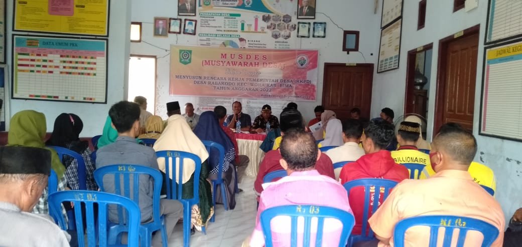 Acara yang dihadiri oleh unsur Pemerintah Desa, BPD, Ketua RT/RW, Pengurus Lembaga Kemasyarakatan Desa serta tokoh agama dan tokoh masyarakat serta dari Pendamping Desa dan Pendamping Lokal Desa ini dibuka secara resmi oleh Kepala Desa Yang Di wakili Oleh Sekretaris desa Rabakodo, Syamsuddin, S.Pd. Dalam sambutannya, Sekretaris Desa menyampaikan bahwa Musyawarah Desa ini merupakan langkah awal penyusunan Rencana Kerja Pemerintah Desa (RKP-Desa) tahun 2022. Dalam musyawarah desa tersebut agenda yang dibahas adalah mencermati ulang dokumen RPJM Desa untuk kegiatan tahun 2022. Selanjutnya sesuai tahapan setelah dilaksanakannya Musyawarah Desa ini adalah pembentukan tim penyusun RKP Desa untuk menyiapkan program-program kerja yang nantinya akan dibahas kembali dalam Musyawarah Perencanaan Pembangunan Desa (Musrenbangdes) mendatang.